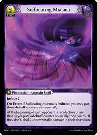 Imbue 2 On Enter: If Suffocating Miasma is imbued, you may put three debuff counters on target ally.