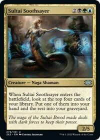 When Sultai Soothsayer enters the battlefield, look at the top four cards of your library. Put one of them into your hand and the rest into your graveyard.