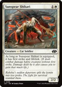 As long as Sunspear Shikari is equipped, it has first strike and lifelink. (It deals combat damage before creatures without first strike. Damage dealt by it also causes you to gain that much life.)