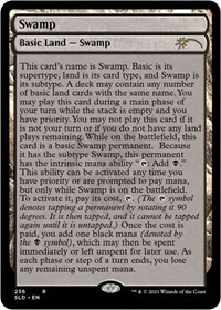 This card's name is Swamp. Basic is its supertype, land is its card type, and Swamp is its subtype. A deck may contain any number of basic land cards with the same name. You may play this card during a main phase of your turn while the stack is empty and you have priority. You may not play this card if it is not your turn or if you do not have any land plays remaining. while on the battlefield, this card is a basic Island permanent. Because it has the subtype Island, this permanent has the intrinsic mana ability "T: Add B." This ability can be activated any time you have priority or are prompted to pay mana, but only blue Swamp is on the battlefield. To activate it, pay its cost, T. (The T symbol denotes tapping a permanent by rotating it 90 degrees. it is then tapped, and it cannot be tapped again until it is untapped.) Once the cost is paid, you add one black mana , which may then be spend immediately or left unspent for later use. As each phrase or step of a turn ends, you lose any remaining unspent mana.