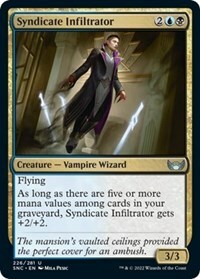 As long as there are five or more mana values among cards in your graveyard, Syndicate Infiltrator gets +2/+2.
