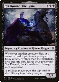 Whenever another creature dies, or a creature card is put into a graveyard from anywhere other than the battlefield, or a creature card leaves your graveyard, Syr Konrad, the Grim deals 1 damage to each opponent.