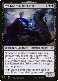 Whenever another creature dies, or a creature card is put into a graveyard from anywhere other than the battlefield, or a creature card leaves your graveyard, Syr Konrad, the Grim deals 1 damage to each opponent.