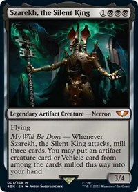 My Will Be Done — Whenever Szarekh, the Silent King attacks, mill three cards. You may put an artifact creature card or Vehicle card from among the cards milled this way into your hand.