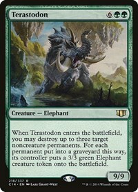 When Terastodon enters the battlefield, you may destroy up to three target noncreature permanents. For each permanent put into a graveyard this way, its controller puts a 3/3 green Elephant creature token onto the battlefield.
