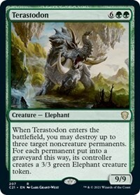 When Terastodon enters the battlefield, you may destroy up to three target noncreature permanents. For each permanent put into a graveyard this way, its controller creates a 3/3 green Elephant creature token.