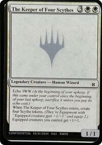 When The Keeper of Four Scythes enters, create four Scythe tokens. (They're Equipment with "Equipped creature gets +1/+1" and equip 2.)