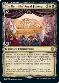 When The Kenriths' Royal Funeral enters the battlefield, exile up to two target legendary creature cards from your graveyard. You draw X cards and you lose X life, where X is the greatest mana value among cards exiled this way.