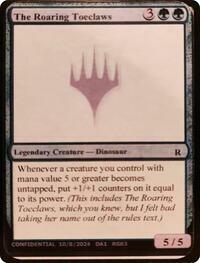 Whenever The Roaring Toeclaws or another creature you control with mana value five or greater becomes untapped, put +1/+1 counters on it equal to its power. (This includes The Roaring Toeclaws, which you knew, but I felt bad taking her name out of the rules text.)