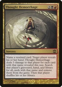 Name a nonland card. Target player reveals his or her hand. Thought Hemorrhage deals 3 damage to that player for each card with that name revealed this way. Search that player's graveyard, hand, and library for all cards with that name and remove them from the game. Then that player shuffles his or her library.