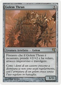 As long as Thran Golem is enchanted, it gets +2/+2 and has flying, first strike, and trample.