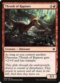 As long as you control another Dinosaur, Thrash of Raptors gets +2/+0 and has trample.