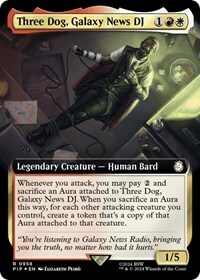 Whenever you attack, you may pay 2 and sacrifice an Aura attached to Three Dog, Galaxy News DJ. When you sacrifice an Aura this way, for each other attacking creature you control, create a token that's a copy of that Aura attached to that creature.
