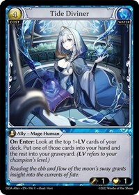 On Enter: Look at the top 1+LV cards of your deck. Put one of those cards into your hand and the rest into your graveyard. (LV refers to your champion's level.)