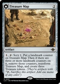 1, T: Scry 1. Put a landmark counter on Treasure Map. Then if there are three or more landmark counters on it, remove those counters, transform Treasure Map, and create three Treasure tokens. (They're artifacts with "T, Sacrifice this artifact: Add one mana of any color.")