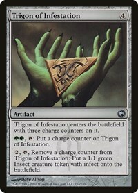 2, T, Remove a charge counter from Trigon of Infestation: Put a 1/1 green Insect creature token with infect onto the battlefield.