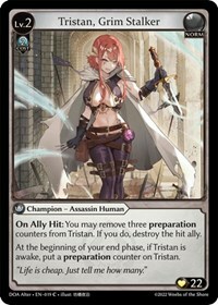 On Ally Hit: You may remove three preparation counters from Tristan. If you do, destroy the hit ally.