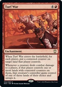 When Turf War enters the battlefield, for each player, put a contested counter on target land that player controls.