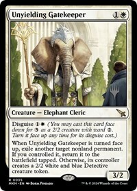 When Unyielding Gatekeeper is turned face up, exile another target nonland permanent. If you controlled it, return it to the battlefield tapped. Otherwise, its controller creates a 2/2 white and blue Detective creature token.