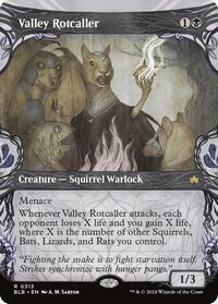 Whenever Valley Rotcaller attacks, each opponent loses X life and you gain X life, where X is the number of other Squirrels, Bats, Lizards, and Rats you control.