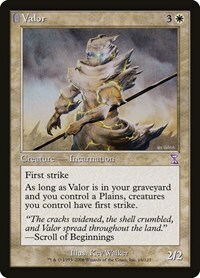 As long as Valor is in your graveyard and you control a Plains, creatures you control have first strike.
