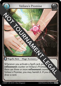 Whenever you activate a Spell card, put a refinement counter on Veilara's Promise. Then if there are three or more refinement counters on Veilara's Promise, you may banish it. If you do, draw a card.