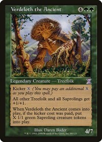 When Verdeloth the Ancient comes into play, if the kicker cost was paid, put X 1/1 green Saproling creature tokens into play.