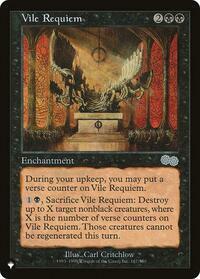 1B, Sacrifice Vile Requiem: Destroy up to X target nonblack creatures, where X is the number of verse counters on Vile Requiem. Those creatures cannot be regenerated this turn.