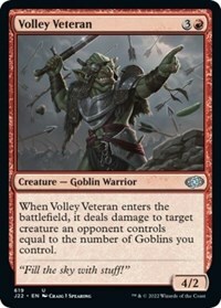 When Volley Veteran enters the battlefield, it deals damage to target creature an opponent controls equal to the number of Goblins you control.