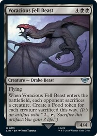 When Voracious Fell Beast enters the battlefield, each opponent sacrifices a creature. Create a Food token for each creature sacrificed this way. (It's an artifact with "2, T, Sacrifice this artifact: You gain 3 life.")