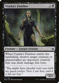 When Vraska’s Finisher enters the battlefield, destroy target creature or planeswalker an opponent controls that was dealt damage this turn.