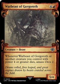 Whenever Warbeast of Gorgoroth or another creature you control with power 4 or greater dies, amass Orcs 2.
