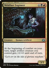At the beginning of combat on your turn, target artifact creature you control gets +2/+0 until end of turn.
