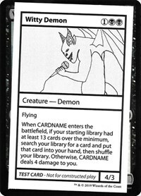 When CARDNAME enters the battlefield, if your starting library had at least 13 cards over the minimum, search your library for a card and put that card into your hand, then shuffle your library. Otherwise, Witty Demon deals 4 damage to you.