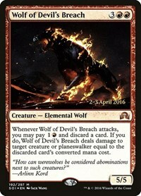 When Wolf of Devil's Breach attacks, you may pay 1R and discard a card. If you do, Wolf of Devil's Breach deals damage to target creature or planeswalker equal to the discarded card's converted mana cost.