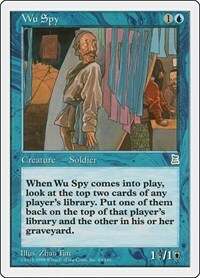 When Wu Spy comes into play, look at the top two cards of any player’s library. Put one of them on the top of that player’s library and the other in his or her graveyard.