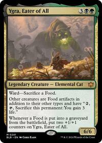 Whenever a Food is put into a graveyard from the battlefield, put two +1/+1 counters on Ygra, Eater of All.