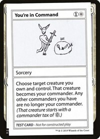Choose target creature you own and control. That creature becomes your commander. Any other commanders you have are no longer your commander. (That creature starts with a commander tax of 0.)