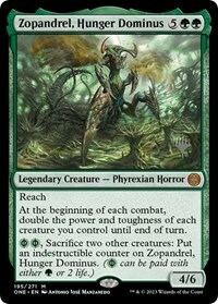 (G/P)(G/P), Sacrifice two other creatures: Put an indestructible counter on Zopandrel, Hunger Dominus. ((G/P) can be paid with either G or 2 life.)