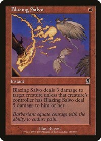 Blazing Salvo deals 3 damage to target creature unless that creature's controller has Blazing Salvo deal 5 damage to him or her.