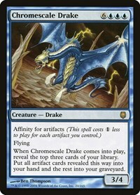 When Chromescale Drake comes into play, reveal the top three cards of your library. Put all artifact cards revealed this way into your hand and the rest into your graveyard.