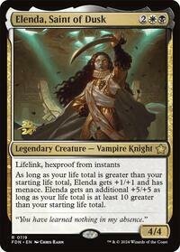 As long as your life total is greater than your starting life total, Elenda gets +1/+1 and has menace. Elenda gets an additional +5/+5 as long as your life total is at least 10 greater than your starting life total.
