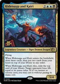 When Hidetsugu and Kairi dies, exile the top card of your library. Target opponent loses life equal to its mana value. If it's an instant or sorcery card, you may cast it without paying its mana cost.