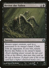 Return target creature card in a graveyard to its owner's hand. Clash with an opponent. If you win, return Revive the Fallen to its owner's hand. (Each clashing player reveals the top card of his or her library, then puts that card on the top or bottom. A player wins if his or her card had a higher converted mana cost.)
